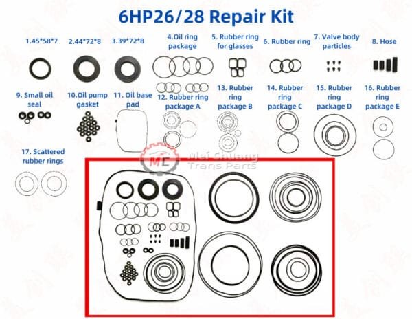 The 6HP26 Transmission Repair Kit is a precision-engineered collection of components designed to address specific hydraulic and mechanical wear within the ZF-platform 6-speed automatic gearbox. Unlike a complete overhaul, this Repair Kit is strategically assembled to provide technicians with the high-quality seals, specialized gaskets, and critical wear-items needed to restore operational integrity to the transmission’s control and pressure systems. As a brand new professional-grade neutral brand product, this kit offers a perfect balance between high-performance materials and cost-efficiency. It is the go-to solution for international automotive service centers and wholesalers who require reliable parts to fix common shifting irregularities without the need for a total transmission teardown. ⚙️💎